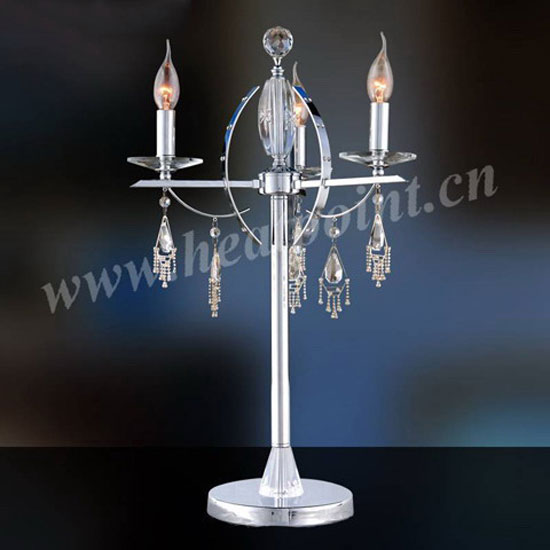This is a table lamp with an elegant design. It features a very strong main body with three candle lights to deliver wide-angle light beams. This lamp is hung with crystal decorations for added uniqueness.