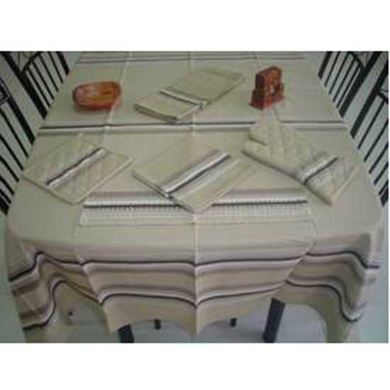 Showcased is a beautiful table linen set featuring ribbed stripes in harmonious colors. The set comes with place mats, a table cloth, napkins, a glove and a pot holder. The simple yet elegant design fits different dining room settings easily.