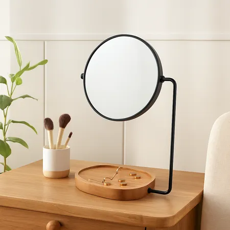 ROUND TABLE MIRROR(1X/2X) W/BAMBOO TRAY & METAL FRAME