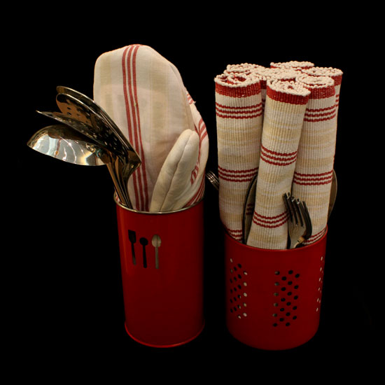 Featured is a series of cotton table textile, cutlery and kitchen utensils. The table textile is beautifully adorned with striped patterns in bright colors. The stainless steel cutlery and kitchen utensils are easy to clean.
