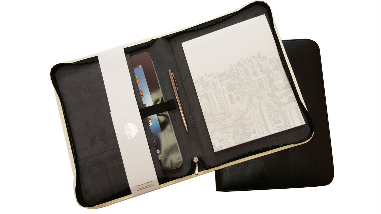 Includes writing pad, pocket ad sleeves for cards, pen and documents