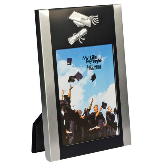 This tabletop photo frame boasts a graduation-themed design with the graphics of a graduation cap and a graduate roll. It is crafted with a clear window to display your memorable keepsake. This tabletop photo frame will make a great addition to your decor.