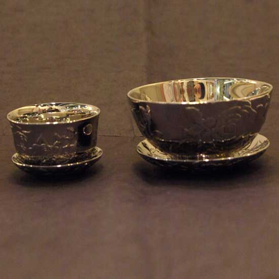 The tableware set includes a cup, a bowl and 2 plates with a stainless steel construction. Each item features a sleek, silvery finish highlighted by embossed patterns, adding an extra touch of style. This tableware set makes a pretty way to enhance your dining table setting.