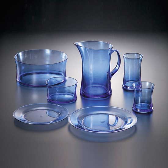 This enticing tableware set features a crystal clear blue body with quenching details. It includes a DOF glass, a highball glass, a 9" plate, an 11" plate, a small salad bowl, a large salad bowl and a 2.5L pitcher. This distinctive tableware set is sure to add some glamor to your home.