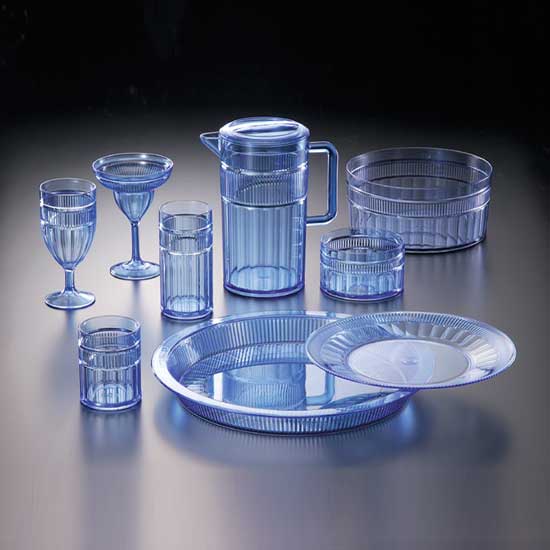 This delicate tableware set in transparent blue comes from our panel series. It contains a DOF glass, a high ball glass, an 11" plate, a small salad bowl, a large salad bowl, a pitcher, an all-purpose glass, a margarita glass and a 15'' tray. They are durably constructed to ensure long time service.