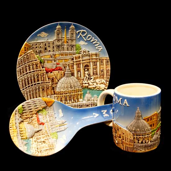 This is a tableware set including a plate, a cup and a spoon. This set is well made with Rome country patterns and detailed craftsmanship. This tableware set is made of ceramic for high durability.