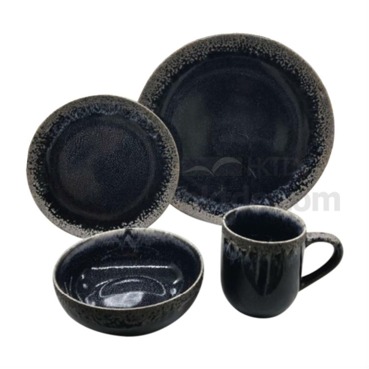 Displayed here is a 4-piece tableware set including a dinner plate, a salad plate, a bowl, and a mug. The set is meticulously crafted of stone and comes in a rustic and natural design. They are great for using as a gift and are suitable for homes, restaurants and hotels.