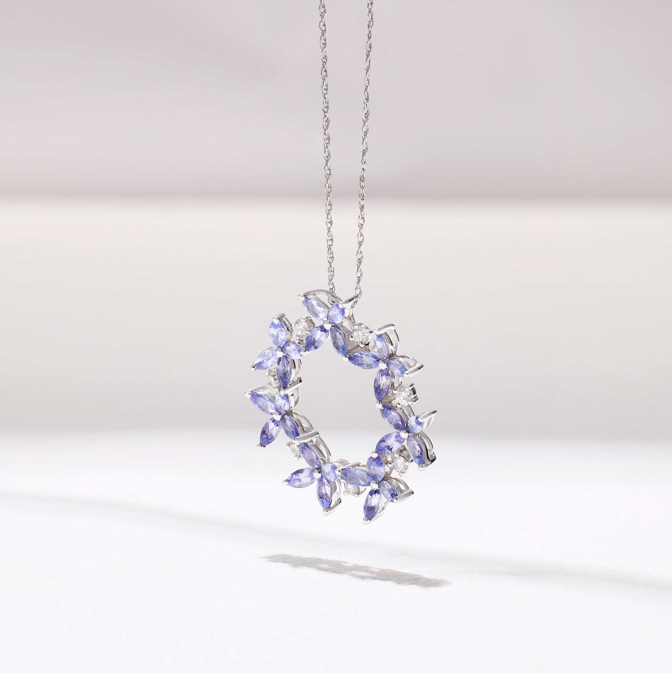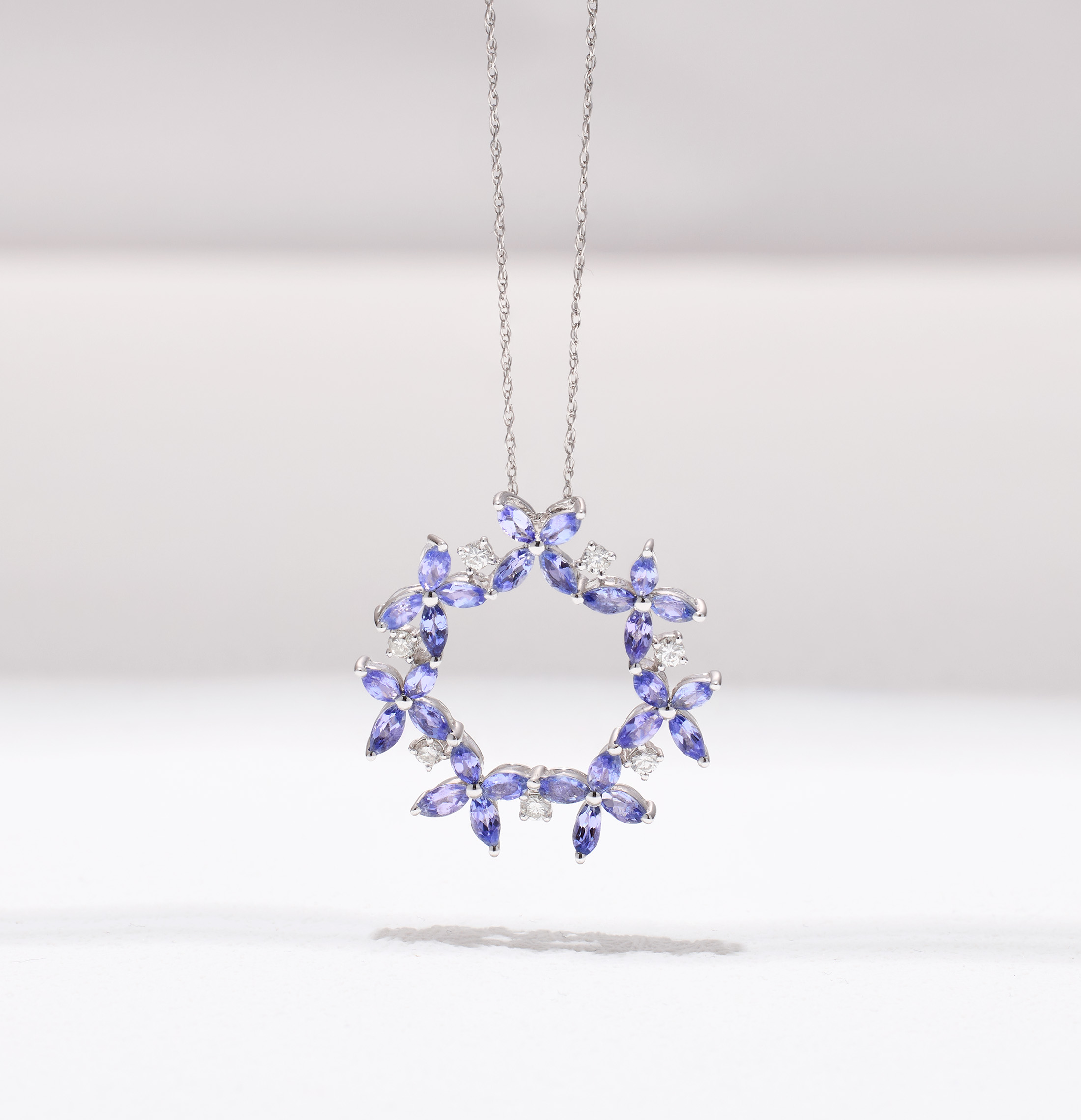 This pendant is the perfect combination of romantic and nature-inspired design, adding a touch of sophistication to any outfit. It is crafted in 18K white gold and features a wreath-like style with marquise-cut tanzanite leaf shapes along a round-shaped outline. The small round diamonds outlining each leaf create an eye-catching effect, further enhancing the pendant's overall look.