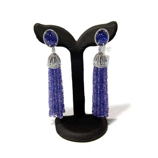 These white gold earrings come with a shiny oval tanzanite on the top and draping tanzanite strands. They are also ornamented with dazzling white stones for a contrasting touch. This pair of brilliant earrings completes your characteristic looks easily.