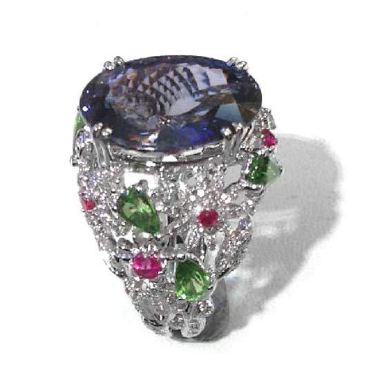 This is a finger ring with a sophisticated and deluxe design. It features a hollow mounting with colorful semi-precious stones and sparkling diamonds. The big tanzanite centerpiece adds a touch of elegance to this ring.