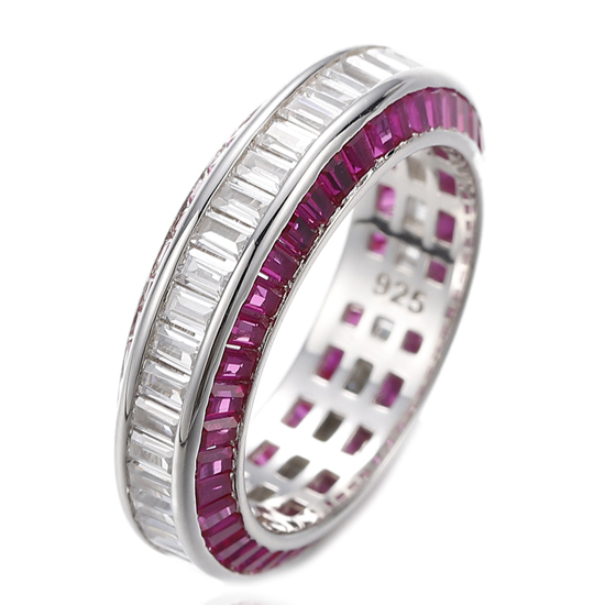 Tapered Ruby Corundum And Baguette White Cubic Zircon Rhodium Silver Ring