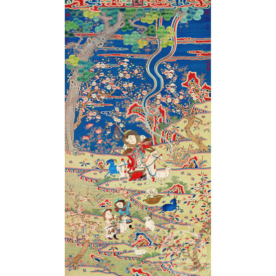This hanging scroll includes subjects dealing with auspicious numbers and themes, including "Three Princes" (homonym for "Three T'ai," signifying an auspicious New Year), "Nine Goats" (indicative of a lucky New Year), and the "Three Friends" (of winter-pine, plum blossom, and bamboo). Taken together, they emphasize that "the Nine Goats dispel the cold of winter, and spring returns with the New Year's start." This was a decorative type of picture displayed every year at the Qing imperial court during the New Year. Qing tapestry and embroidery is renowned for its fine weaving and numerous techniques. The tapestry technique of this scroll consists of a blue background and background scenery (colored auspicious clouds and rocks with water), the weaving for the figures, plants, and animals featuring several different tapestry and embroidery techniques. Areas for the plum blossoms, pine needles, and tree trunks are done as tapestry and embroidery on the patterning with touches of brushwork and color washes added. This is a typically decorative style of the Qianlong reign (1736-1795) with its pursuit of complexity and perfection. The composition is filled with rich designs and patterns, and the arrangement of colors fine and opulent, exuding a joyously festive appearance. This is a representative example combining tapestry, embroidery, and painting.