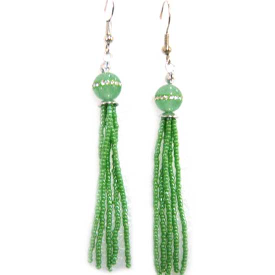 Displayed is a pair of tassel earrings that comes in a refreshing apple green color. The tassels are made 5 strands of seed beads for a dynamic effect. The earrings use a fish hook closure for convenient wearing.