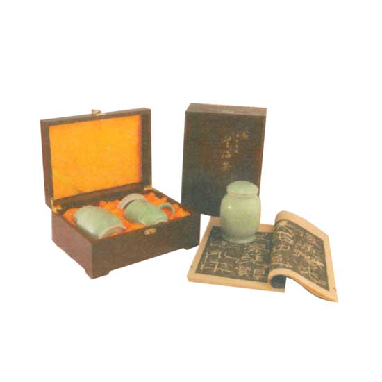 Displayed is a box of Wanghai tea that comes in a wooden box for a classic style. Preserved inside celadon jars, this tea is aromatic and has a lingering note. This tea is carefully selected for your enjoyment.