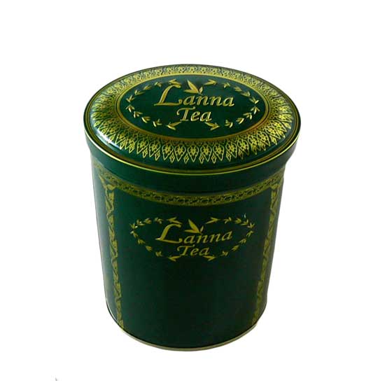 This is a tin box designed for packaging tea. It is crafted in a tube shape with a green exterior. The golden patterns highlight this box in an elegant way.