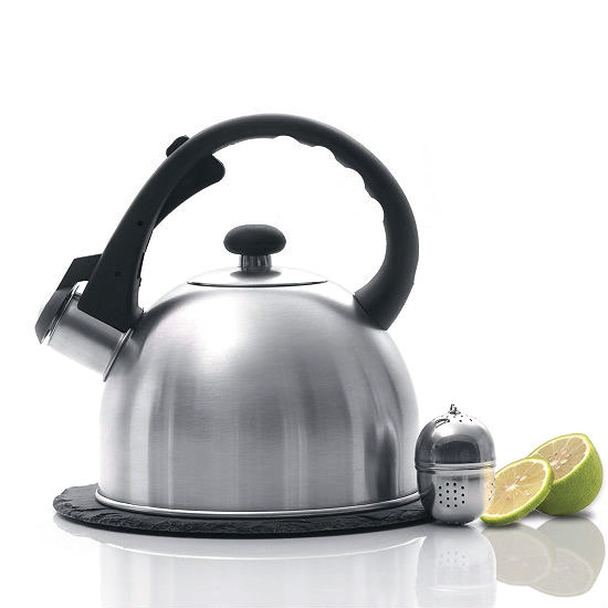 This is a high-quality tea set with a stainless steel whistling tea kettle, a round slate trivet and a stainless steel tea ball. It is finely made for reliability and durability. This elegant tea set is ideal for household use.