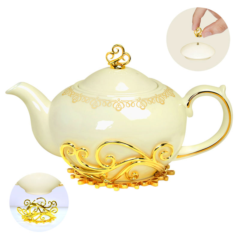 • Golden swirling decal accents along the teapot mouth.