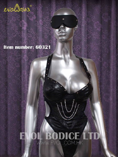 Straps around the neck and 3 chains accented partly decorated by metal embellishments.