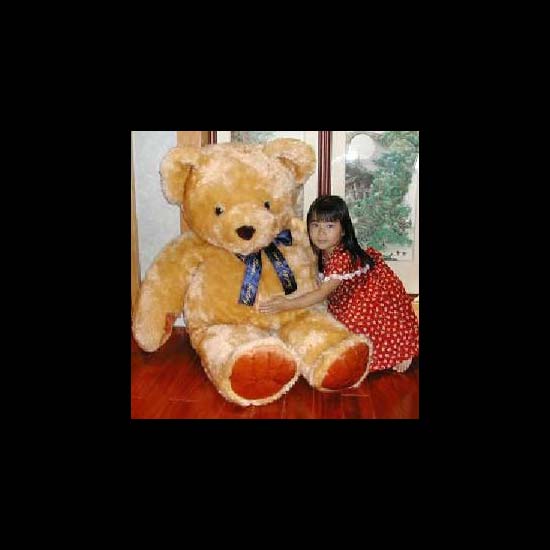 - A deluxe teddy bear of great proportions with a blue ribbon bow around its neck