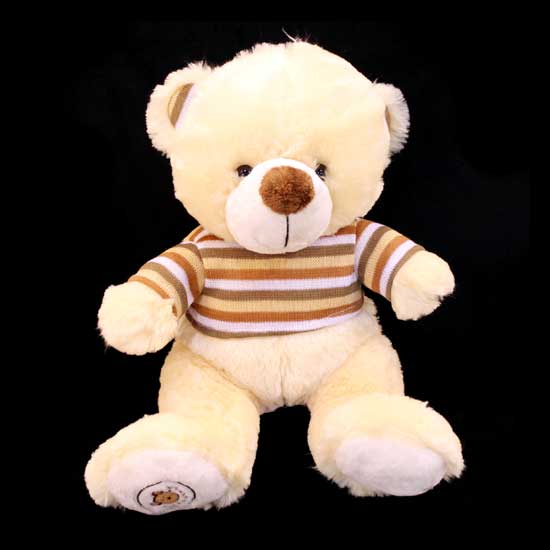 This adorable beige teddy bear is dressed in a striped pullover with a breezy touch. His small eyes and protruding big nose give an innocent look. This lovely soft bear is sure to win over the favor of your kid.