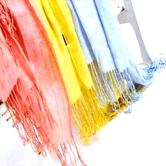 Displayed are three woven scarves that are utterly made of tencel. Their ends are trimmed with nice fringes. These scarves are ideal for accessorizing casual wear while offering extra warmth.