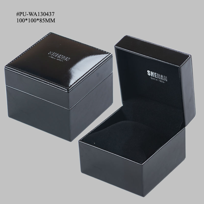 Shiny black smooth surface sythetic leather, stitching top with deboss print. Classic and finest look would match up your product.