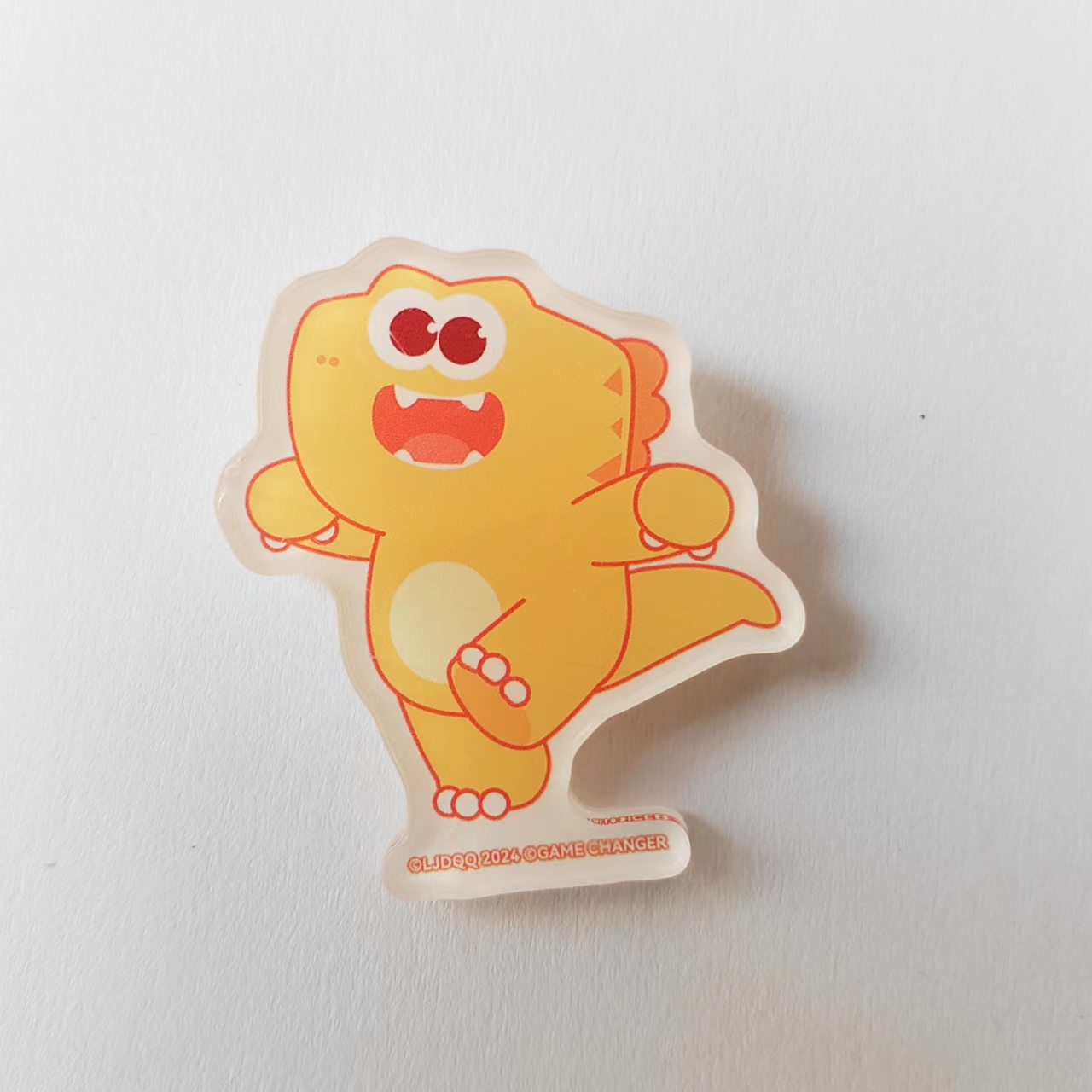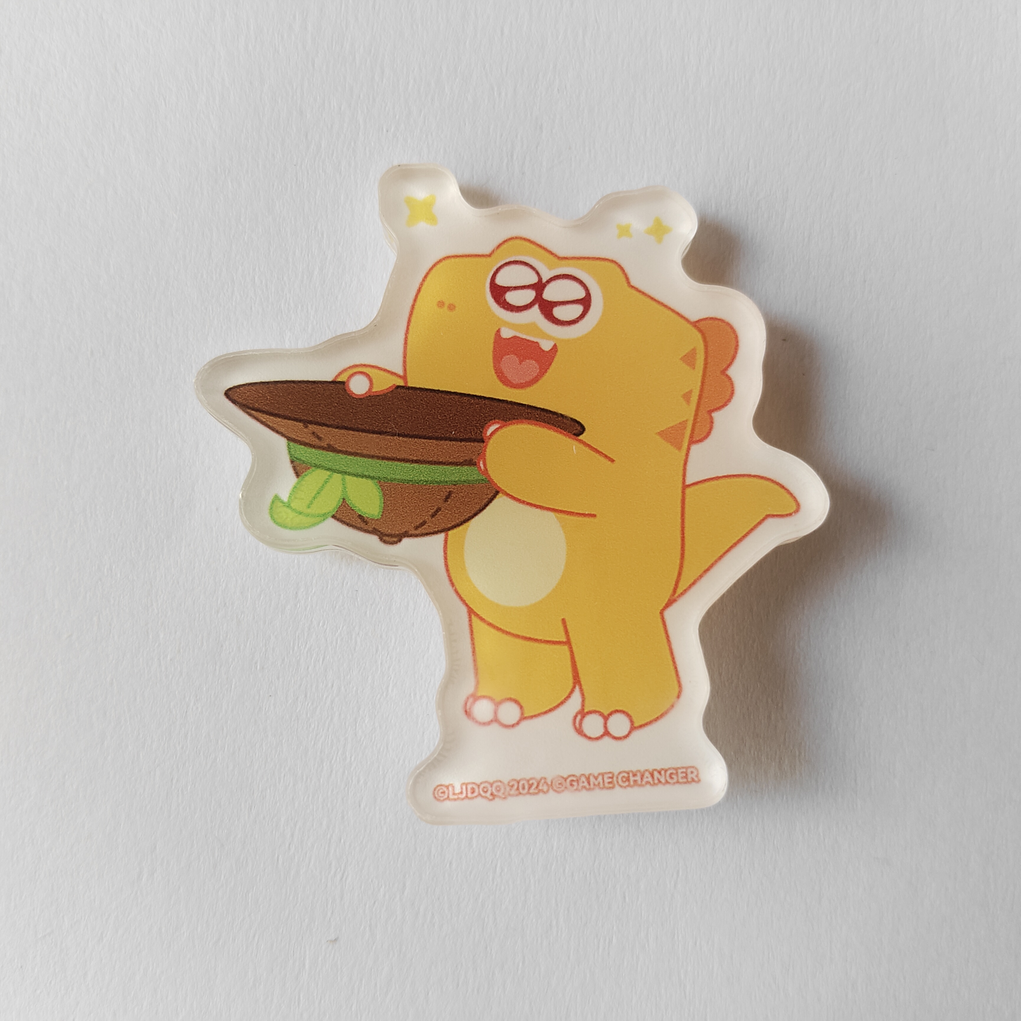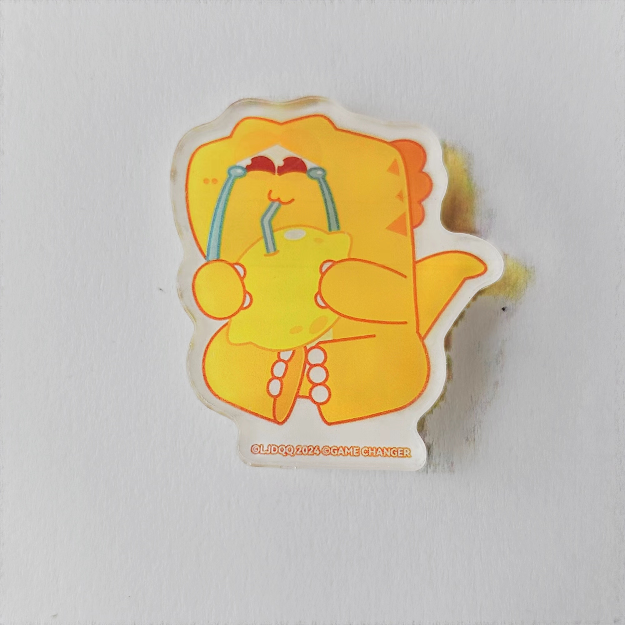 The acrylic badge of the dinosaur Qiqi theme series, Qiqi wearing a hat, Qiqi wearing a red cotton jacket, Qiqi holding a hat, Qiqi eating lemons, Qiqi eating bananas, the original Qiqi and Qiqi sitting on the ground crying, a total of seven images.