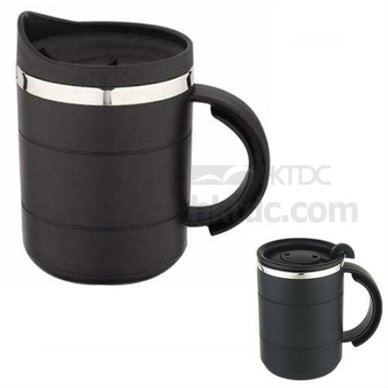 The shown thermo mug is a right choice to be placed on your office desk. Coming in black with a silvery rim on top, this mug displays a simple and common design, making it a perfect mug for businessmen. This nice thermo mug finishes with a plastic lid and a handle which add a hint of user-friendliness.