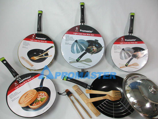 - This thin/light cast iron wok set including some bamboo and steel accessories.