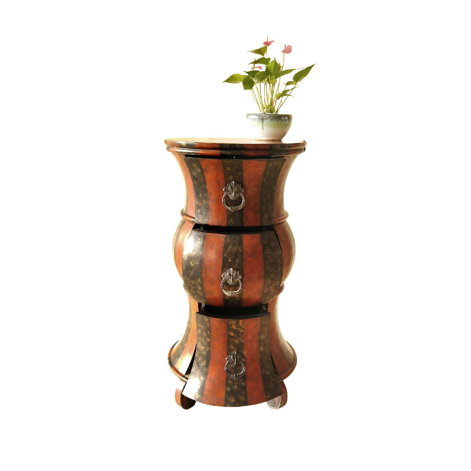 This accent cabinet features a cylindrical silhouette crafted with a curvy design. It is designed to provide ample storage space with three pull-out drawers. Boasting an antique style, this accent cabinet offers an eye-catching addition to your living room or entryway.