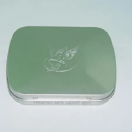 - Rectangular shape with embossed logo on lid & with non-pin hinge.