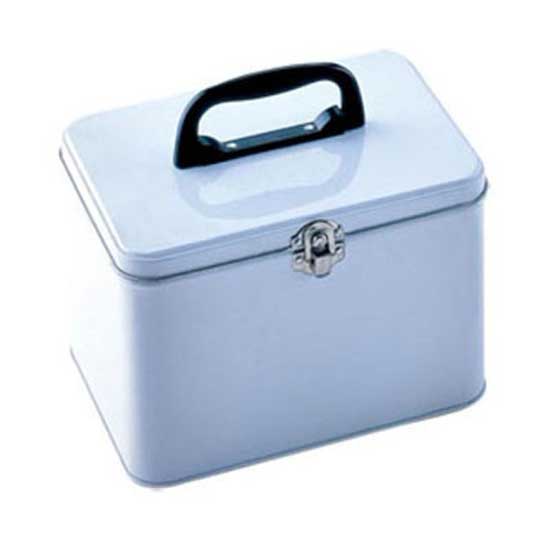 This tin lunch box comes in a rectangular shape in bright white with a polished finish. The top is designed with a black handle for convenient carriage. The sturdy box is finished with a metal lock for closure.