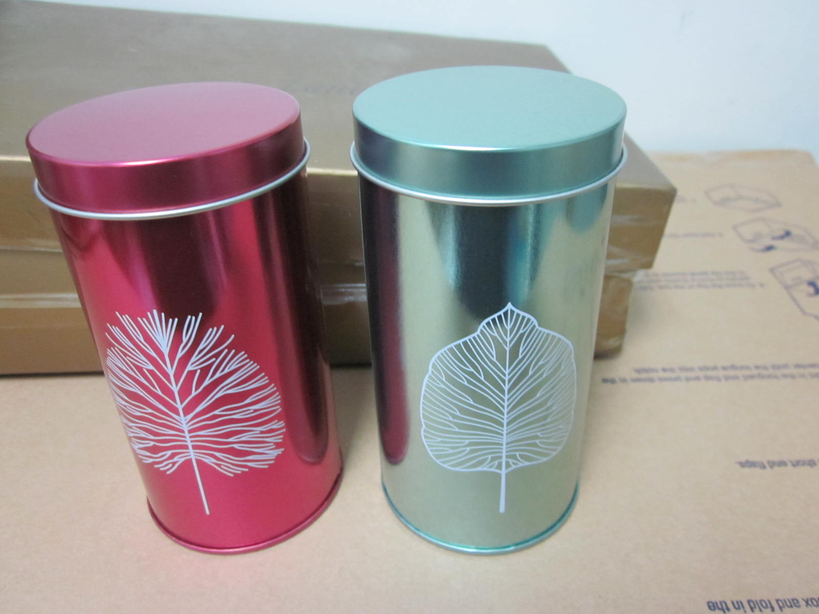 Tea lovers will find this cylindrical tin can in an elegant design optimal for storing tea leaves. The can is in a distinctive glossy finish with a simple leaf pattern whose veins are depicted in detail. Covered with a tinplate lid, this container will trap the refined flavor in the leaves. The inside also boasts a generous capacity for your favorite tea.