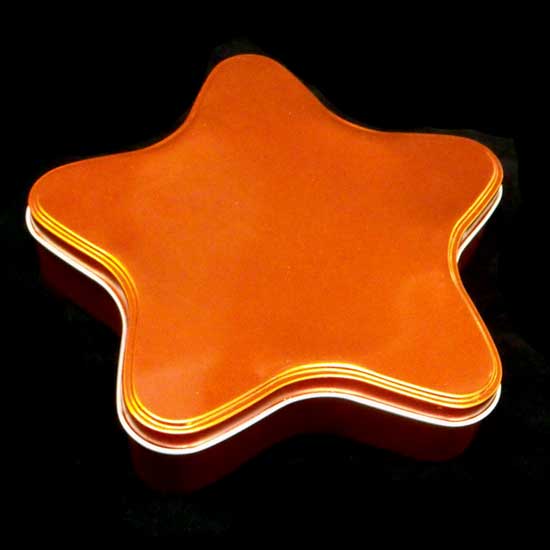Displayed here is a tinplate box in an eye-catching orange color. It is characterized by a star-shaped design. This tinplate box is an ideal choice for your product packaging.