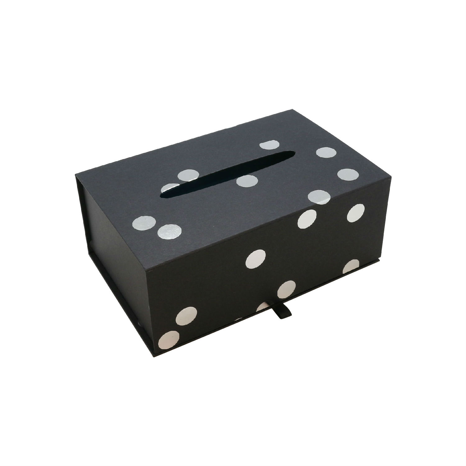 Displayed here is a tissue box with a lovely design. It is rectangular shaped and has a black background color with silvery foil patterns. This tissue box has a flip top with magnetic closure and has an oval cutout at the flap for pulling tissues out with ease.