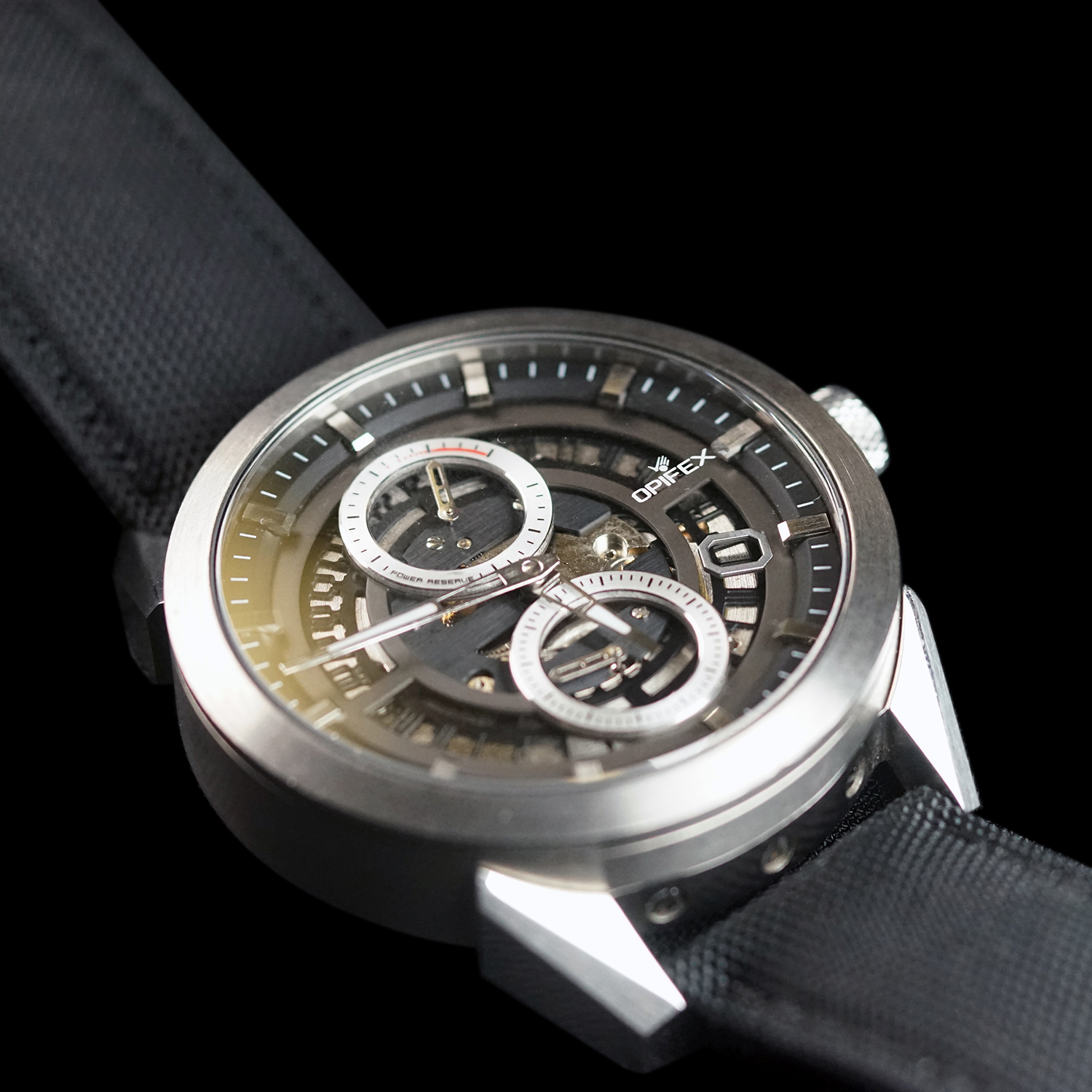 Feel the overwhelming pulse of sophistication with this dashing wristwatch. Masterly polished with an ultralight titanium case, the rugged piece boasts a unique semi-skeleton dial to showcase the intricate mechanism of the automatic movement. Paired up with a water-resistant canvas strap, the premium timepiece flaunts a gentle hug around your wrist for around-the-clock comfort.