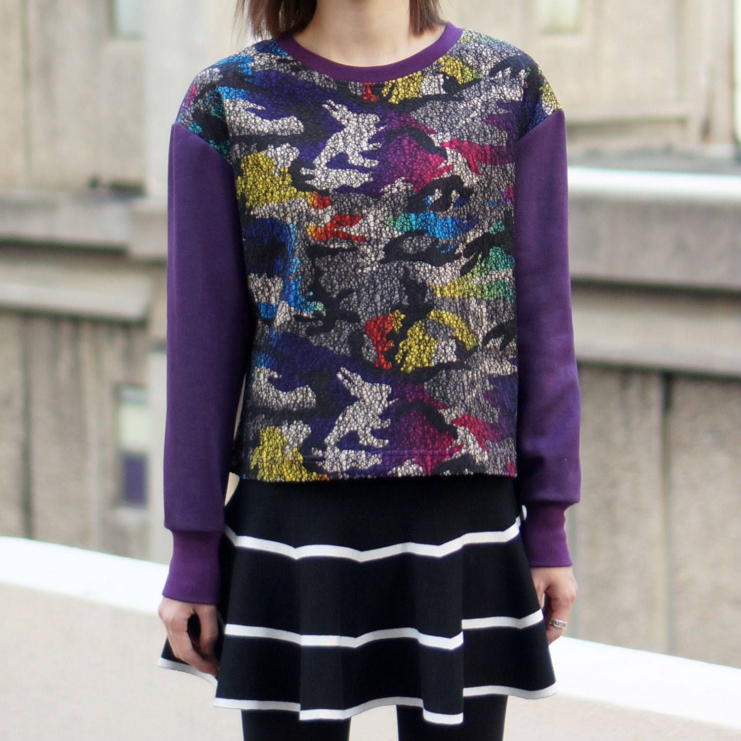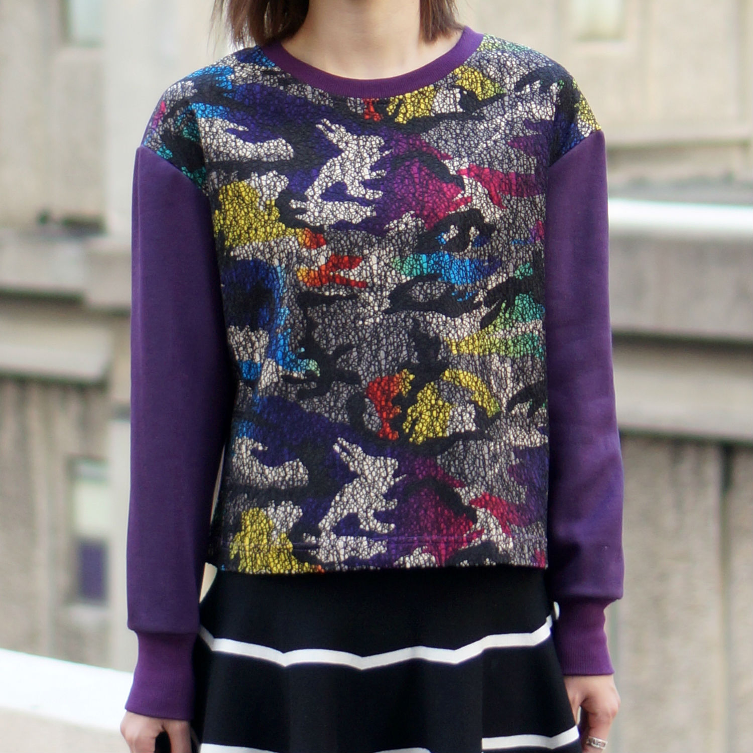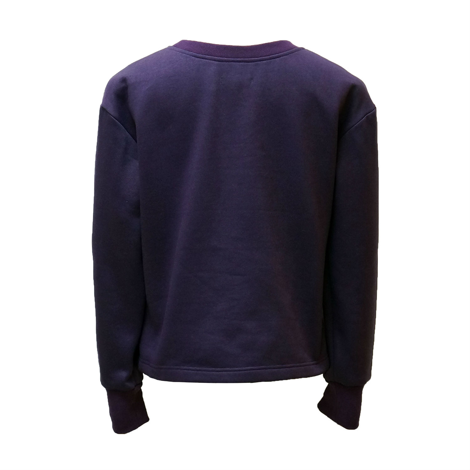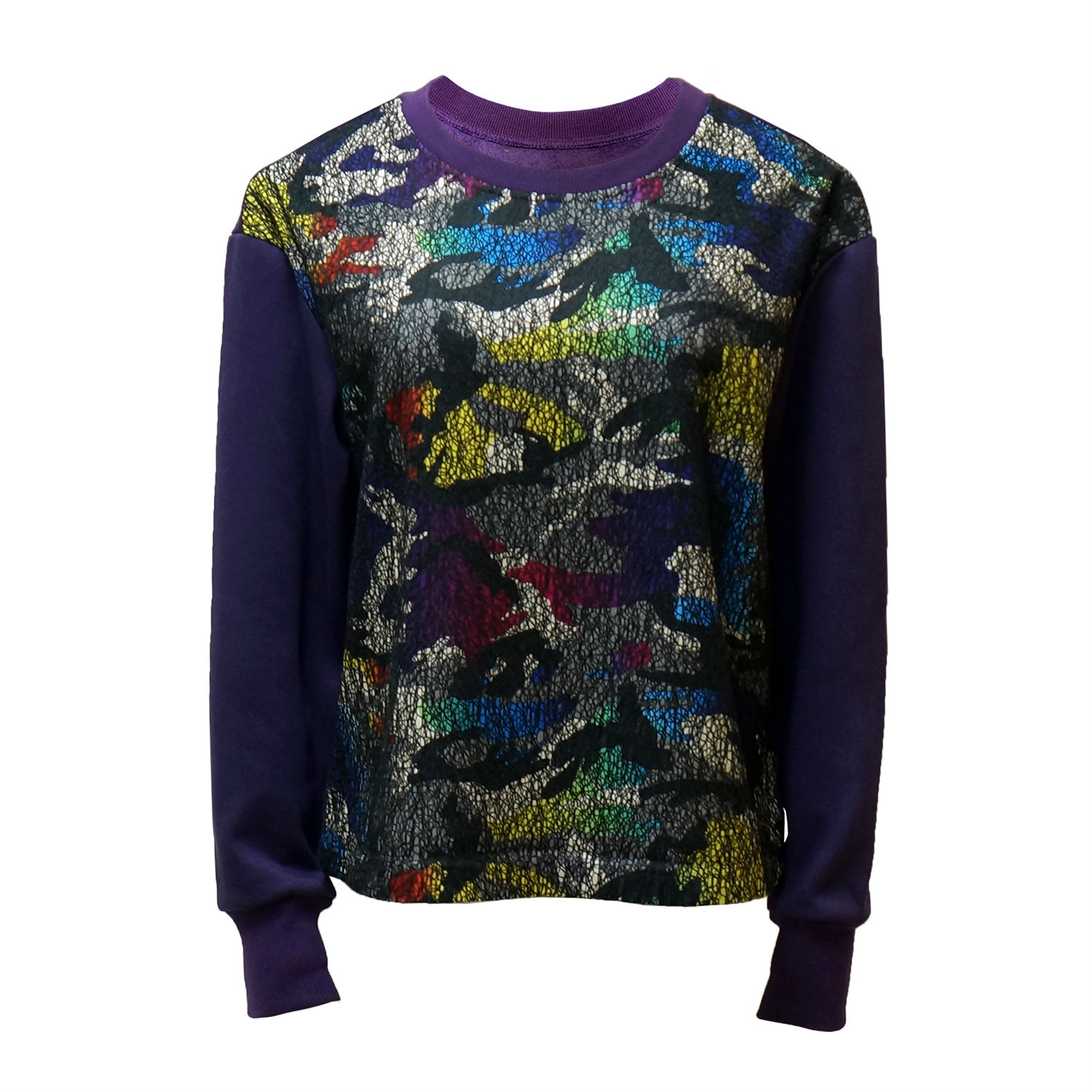 Long sleeve crewneck sweatshirt in purple. Inside-out camouflage printing and mesh bonding at front. Fleece interior. Tonal stitching. Ribbed crewneck collar and cuffs.