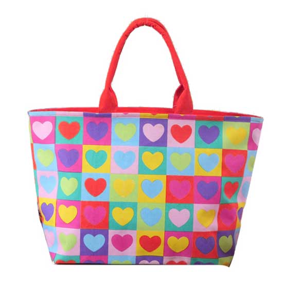 The tote bag is designed to showcase a great touch of romance. The tote bag features heart-shaped patterns in bright colors. The stylish design makes it easy to be matched with your casual wear for trendy look.
