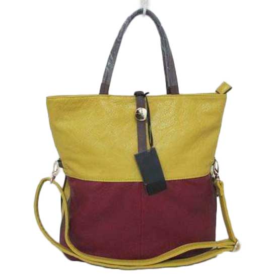 Displayed is a tote bag featuring a bi-color design. The upper part of the bag is in yellow while the lower half in red for a contrasting effect. This high quality tote bag also comes with an adjustable shoulder strap for your convenience.