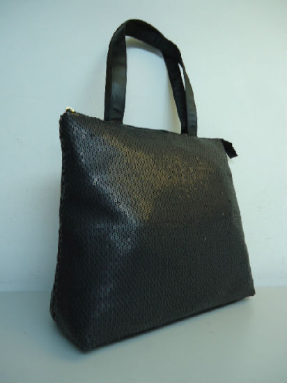 Highlighted here is satin tote bag adorned with allover sequins. It has a spacious compartment for storage and has a top nylon zipper for closure. this tote bag has two flat handles on top for carrying and would make an excellent gift for ladies.