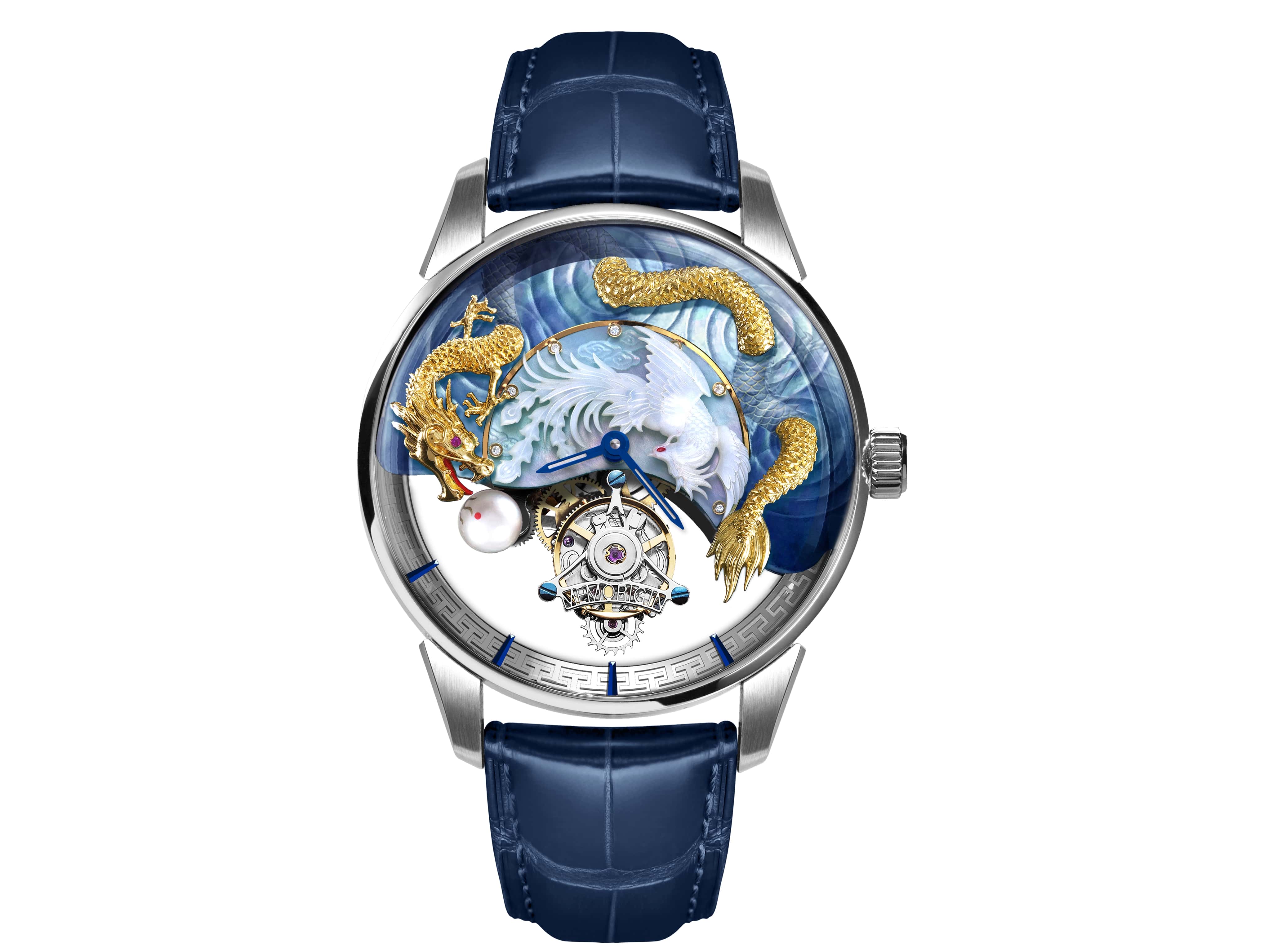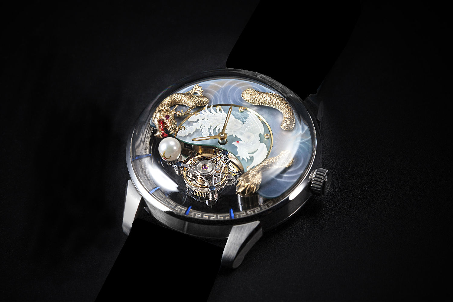 Introduce a sumptuously gorgeous addition to your timepiece collection with this tourbillon watch. Meticulously crafted with scrupulous care, it captured the perfect harmony of yin and yang through a pair of mythological creatures. At the heart of the dial marks a pellucid phoenix soaring freely under the sunset to echo with the picturesque dragon that is sailing through the ocean. Masterly rendered with a dome-shaped sapphire glass, it allows you to appreciate the horology of the suspended tourbillion motor at any angles.