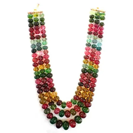 Highlighted is a tourmaline necklace with a graceful three-strand design. The full tourmaline beads boast various colors in a neat arrangement. Adorn yourself with this traditional necklace.