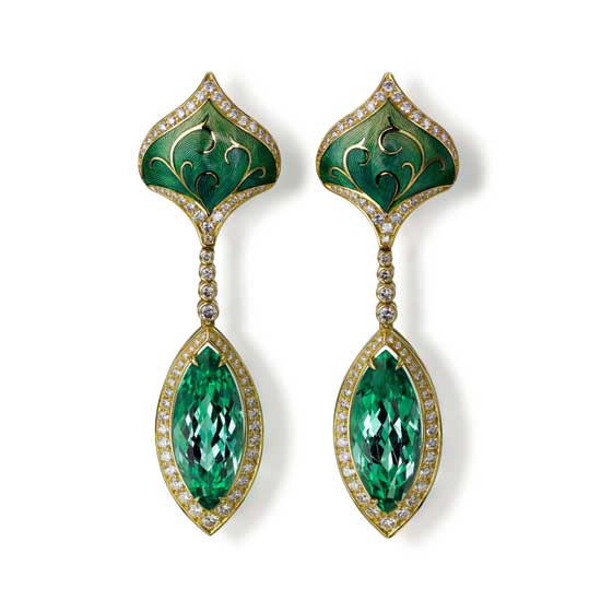 This pair of noble earrings comes with an olive shaped green tourmaline dangling naturally. It is also complemented with sparkling stones along the golden rims. This pair of eye-catching earrings is a great addition to your jewelry box.