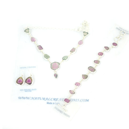 This is a jewelry set that includes a pair of earrings, a bracelet and a necklace with a matching design. The tourmaline gemstones in bright colors add a touch of elegance to each piece. This refined jewelry set pairs with your outfit elegantly.