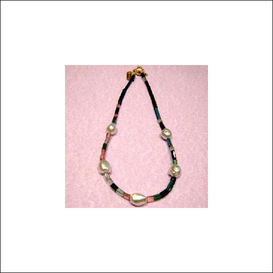 Necklace of cylindrical tourmaline and five precious keshi pearls.