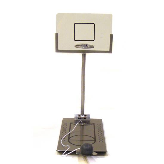 The featuring item is a set of toy basketball game made of metal materials. It includes a grey ball attached to a basketball court with a string, in which you can shoot just by pressing the board where the ball is.