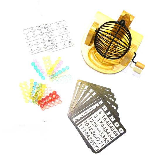 This bingo set comes with a drawing machine, balls, bingo number sheets and stickers for a real bingo game. The mini drawing machine is made of wood with nice details. Enjoy a bingo game with a group of friends with this toy set.