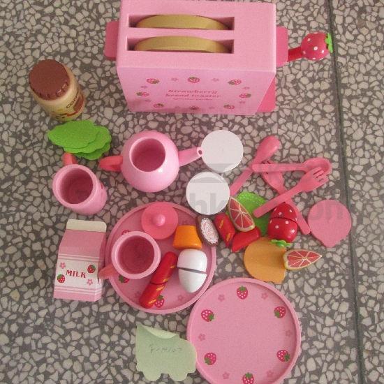 Children will enjoy so much fun playing pretend tea parties with this toy set. The set includes a bread toaster with cutleries and other food items, which are all crafted with appealing textural details. As decorative touches, the wooden pieces come with sweet strawberry patterns