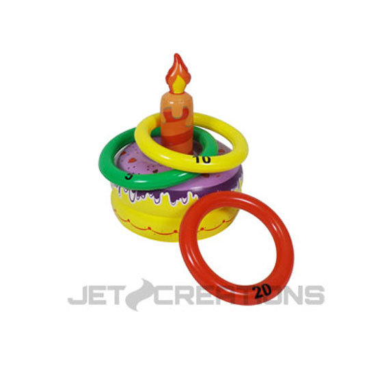 This is a toy cake with a big candle. It is printed with colorful patterns for added style. This toy comes with three rings for added fun.