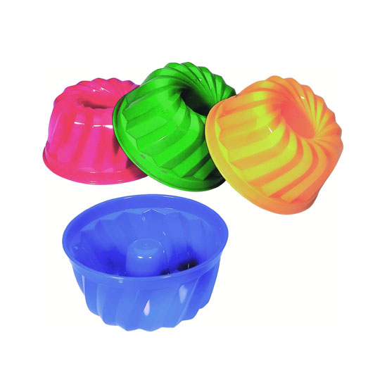 This is a collection of toy cake molds that comes in assorted colors. Made of PVC-free plastic, these toy cake molds are safe for children. These durable toy cake molds can be stacked for space-saving storage.